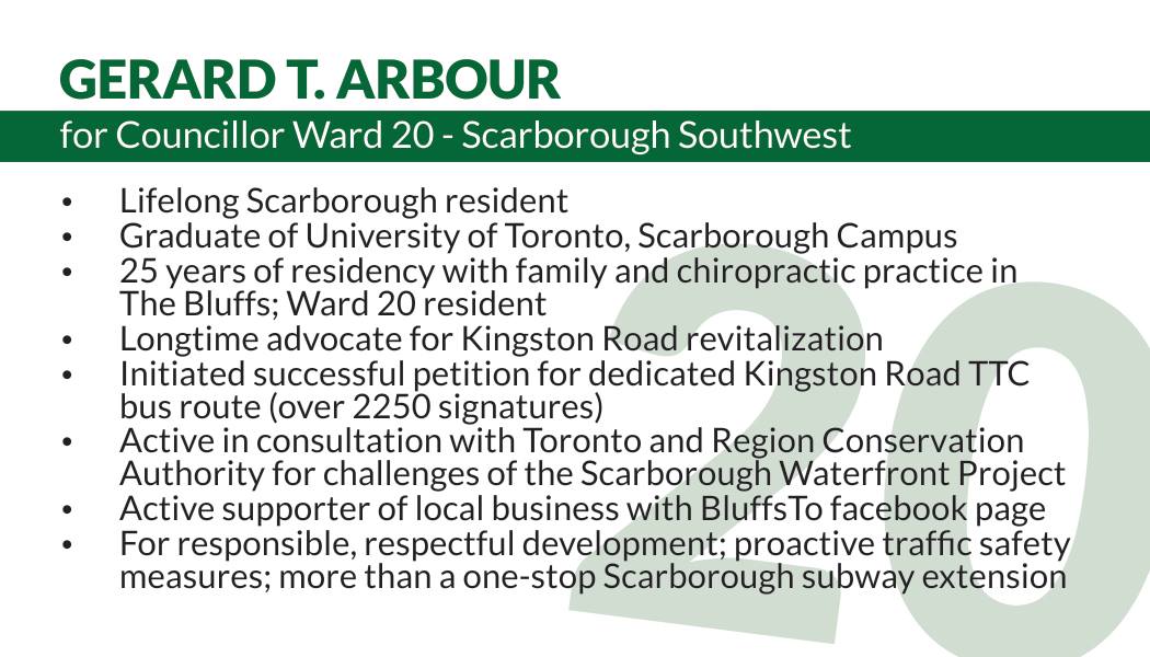 Gerard Arbour: Hello to The Voice. With respect to the questions asked, I will be as succinct as possible with the uncertainty of Ward 20 or 38 in which I am running. Thought you should know I signed the Candidate Pledge on Poverty Reduction. Please note the 3 leading mayoral candidates signed as well. In it I pledged, if elected to Toronto Council, "to work with community, business and faith leaders to reduce poverty and inequality in Toronto and to support the full funding and implementation of Toronto's Poverty Reduction Strategy...including the following approved actions: 1. 7200 new supportive housing units, at least 8000 new deeply affordable rental housing units, and 1000 new shelter spaces. 2. Reduced TTC fares for an additional 157,000 lower income adults. 3. 11,500 new child care spaces, including 5,000 subsidized spaces. 4. 40,000 new recreation program spaces.